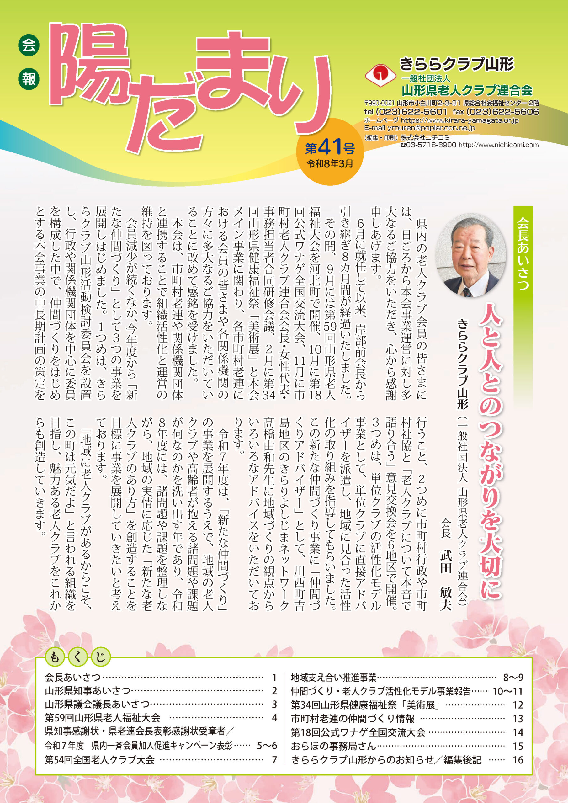 電話023-622-5601 FAX023-622-5606※この会報は、市町村老人クラブ連合会を通じて配布しております。 -