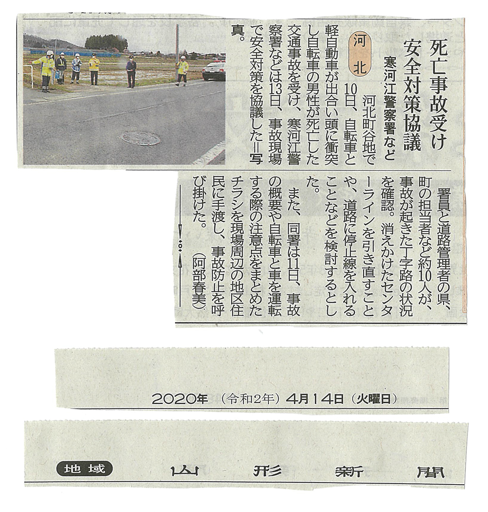地域活動 交通死亡事故の対応と連携 河北町老連 2020年4月16日 令和2年4月10日、河北町内で発生しました交通死亡事故では、私たち河北町老人クラブにおいても、会員等に対して防止周知の取り組みを強化していきます。 現在、新型コロナウイルス感染拡大予防のため、外出や会合の開催などを見合わせていますが、寒河江警察署で作成しましたチラシが配布されましたので、関係機関団体との連携協力で自らが...